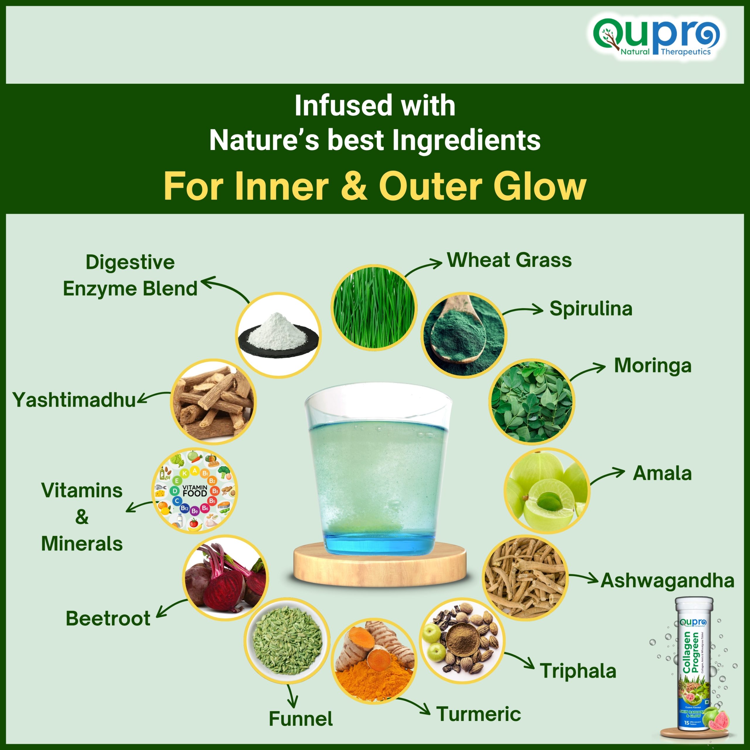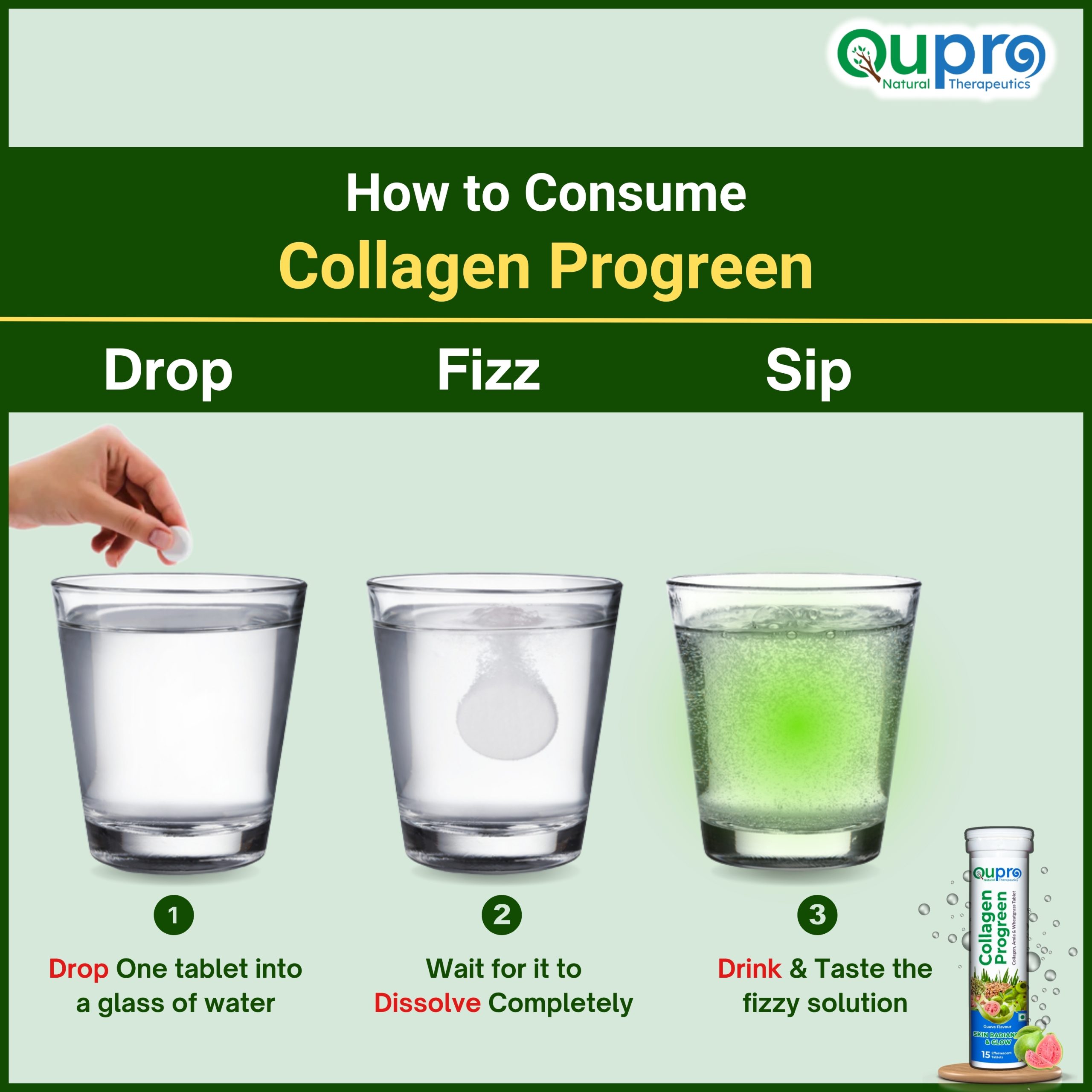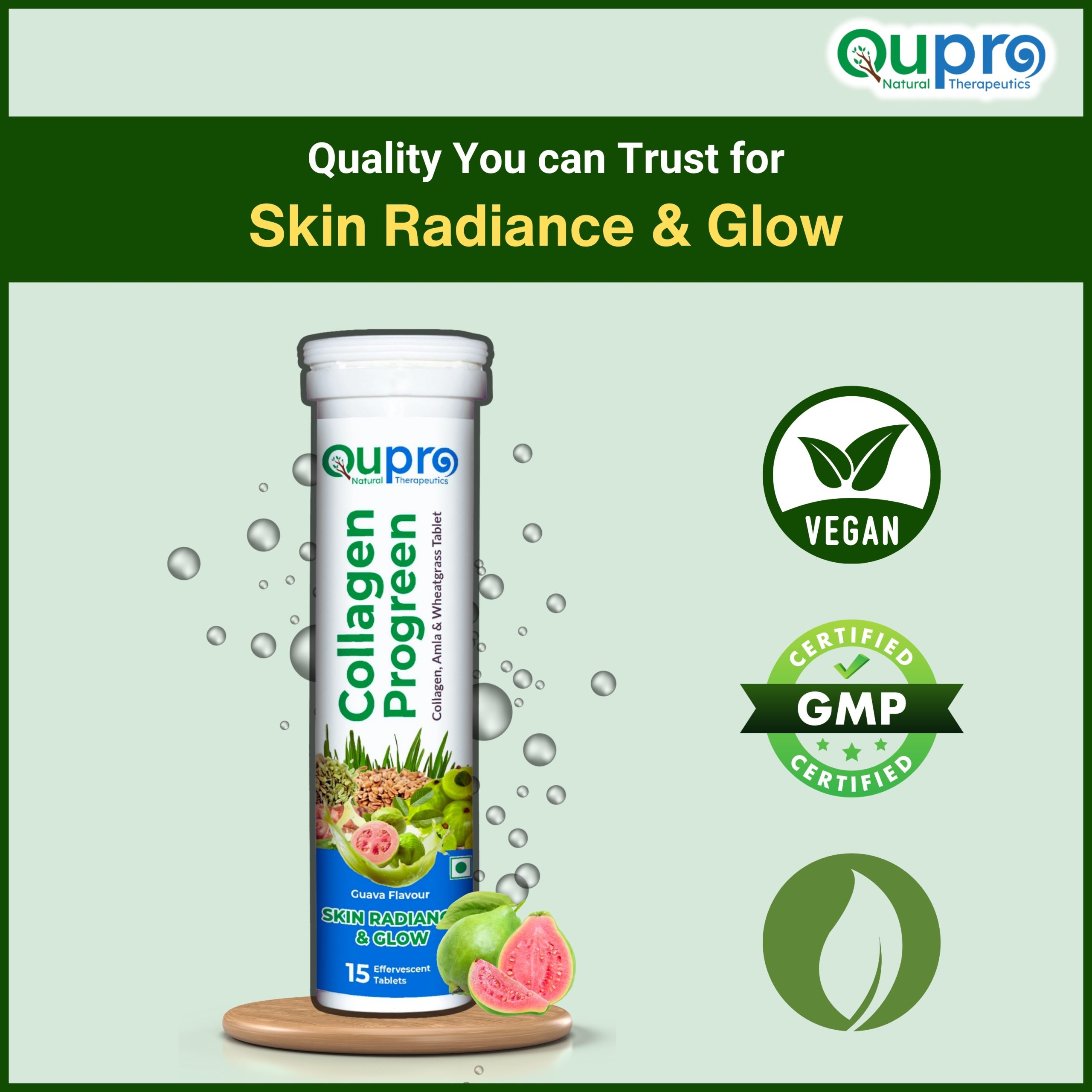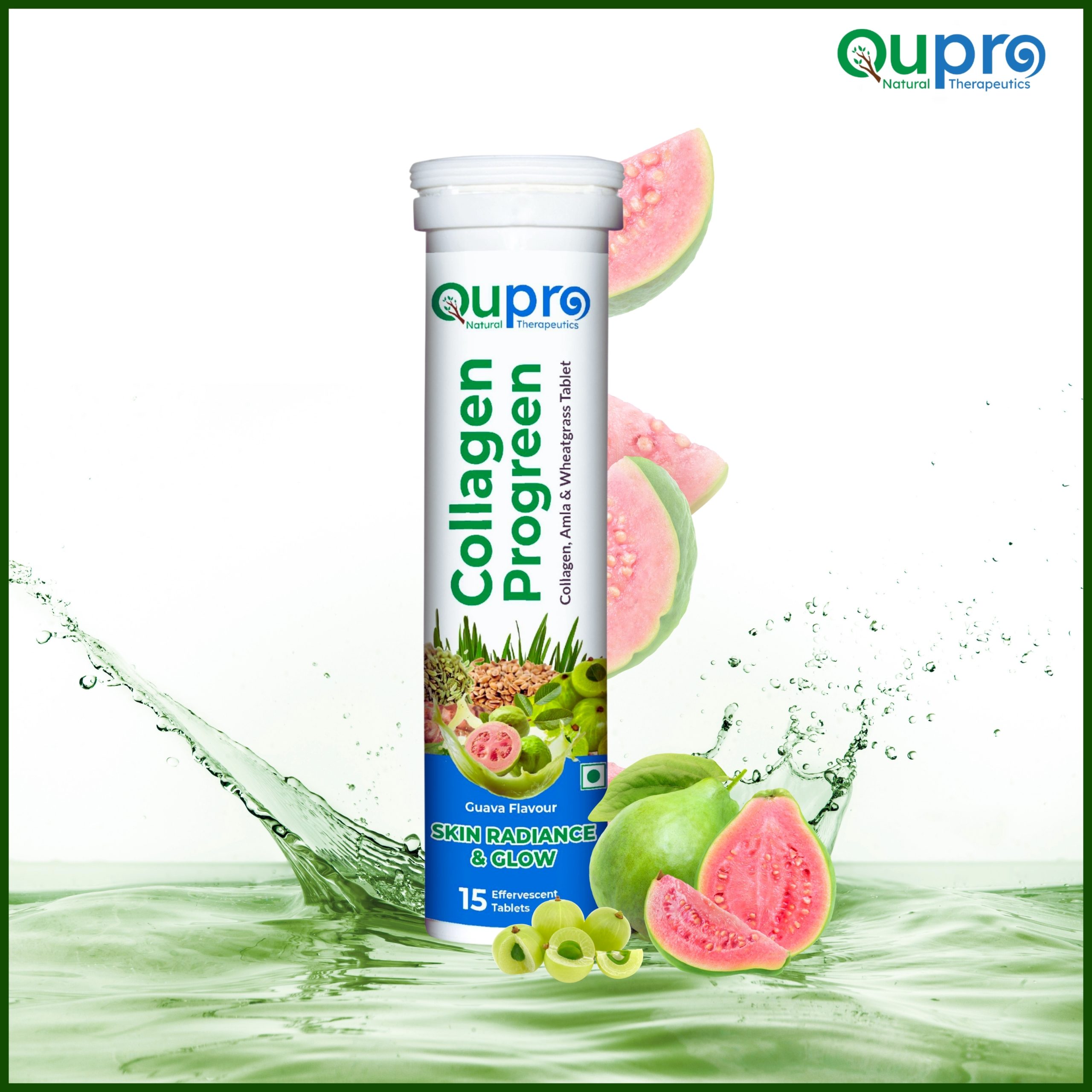 Qupro Collagen Progreen is a revolutionary plant-based effervescent collagen supplement designed to enhance your skin radiance, hair strength, joint flexibility, and overall energy. Formulated with a powerful blend of superfoods, herbs, and vitamins, it offers a 100% vegan alternative to traditional collagen — naturally supporting your body’s rejuvenation and repair processes.